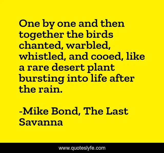 This page presents the quote "One by one and then together the birds chanted, warbled, whistled, and cooed, like a rare desert plant bursting into life after the rain.". Author of this quote is Mike Bond, The Last Savanna. This quote is about chanted, life, nature, africa, plant, rain, desert, whistled, cooed,.