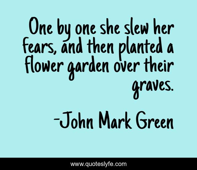 This page presents the quote "One by one she slew her fears, and then planted a flower garden over their graves.". Author of this quote is John Mark Green. This quote is about warrior, confidence, woman, positive, empowered, fears, empowered-living-for-women, overcoming-the-past, strong-women,.