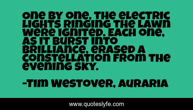 This page presents the quote "One by one, the electric lights ringing the lawn were ignited. Each one, as it burst into brilliance, erased a constellation from the evening sky.". Author of this quote is Tim Westover, Auraria. This quote is about electricity, lights, stars, nature,.
