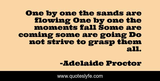 This page presents the quote "One by one the sands are flowing One by one the moments fall Some are coming some are going Do not strive to grasp them all.". Author of this quote is Adelaide Proctor. .