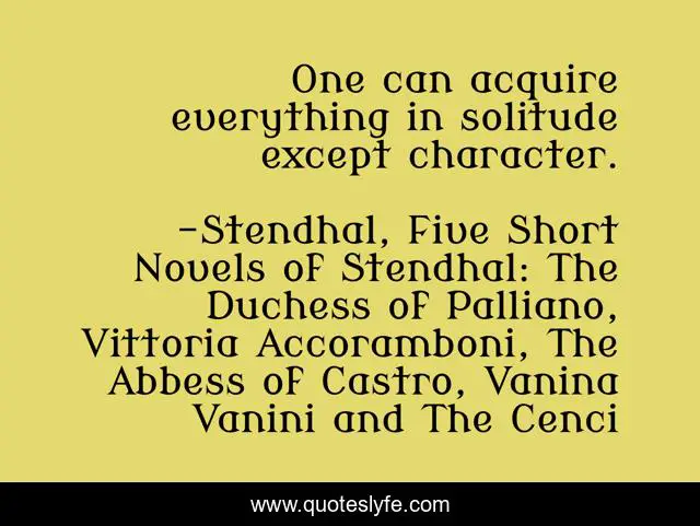 This page presents the quote "One can acquire everything in solitude except character.". Author of this quote is Stendhal, Five Short Novels of Stendhal: The Duchess of Palliano, Vittoria Accoramboni, The Abbess of Castro, Vanina Vanini and The Cenci. .