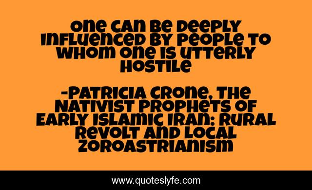 This page presents the quote "One can be deeply influenced by people to whom one is utterly hostile". Author of this quote is Patricia Crone, The Nativist Prophets of Early Islamic Iran: Rural Revolt and Local Zoroastrianism. This quote is about culture, politics,.