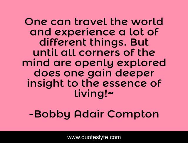 This page presents the quote "One can travel the world and experience a lot of different things. But until all corners of the mind are openly explored does one gain deeper insight to the essence of living!~". Author of this quote is Bobby Adair Compton. This quote is about spirituality, mind-expansion, self-exploration, wisdom,.