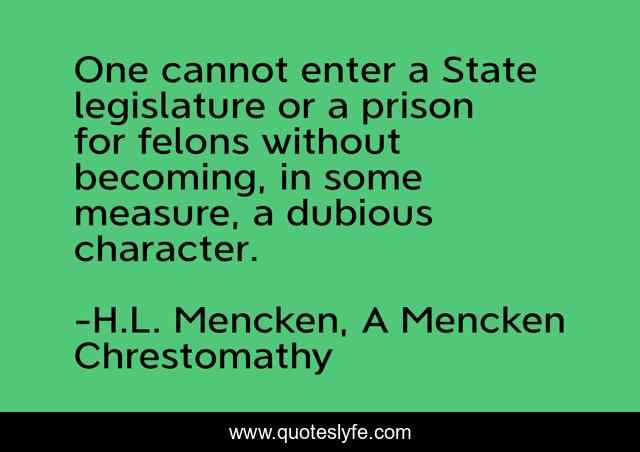 This page presents the quote "One cannot enter a State legislature or a prison for felons without becoming, in some measure, a dubious character.". Author of this quote is H.L. Mencken, A Mencken Chrestomathy. This quote is about politics, politicians,.