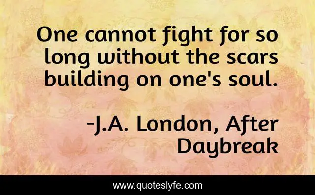 This page presents the quote "One cannot fight for so long without the scars building on one's soul.". Author of this quote is J.A. London, After Daybreak. This quote is about scars, souls, fight,.