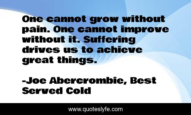 This page presents the quote "One cannot grow without pain. One cannot improve without it. Suffering drives us to achieve great things.". Author of this quote is Joe Abercrombie, Best Served Cold. This quote is about fantasy, suffering, pain, grow, achievement,.