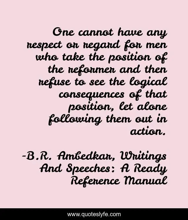This page presents the quote "One cannot have any respect or regard for men who take the position of the reformer and then refuse to see the logical consequences of that position, let alone following them out in action.". Author of this quote is B.R. Ambedkar, Writings And Speeches: A Ready Reference Manual. This quote is about respect, reformers, man,.