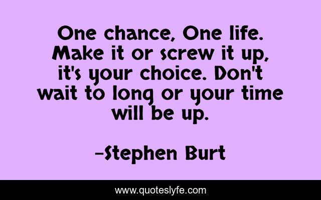 This page presents the quote "One chance, One life. Make it or screw it up, it's your choice. Don't wait to long or your time will be up.". Author of this quote is Stephen Burt. This quote is about inspirational-life, enthusiasm, inspirational,.