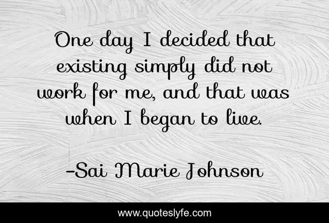 This page presents the quote "One day I decided that existing simply did not work for me, and that was when I began to live.". Author of this quote is Sai Marie Johnson. This quote is about existence, life, living,.