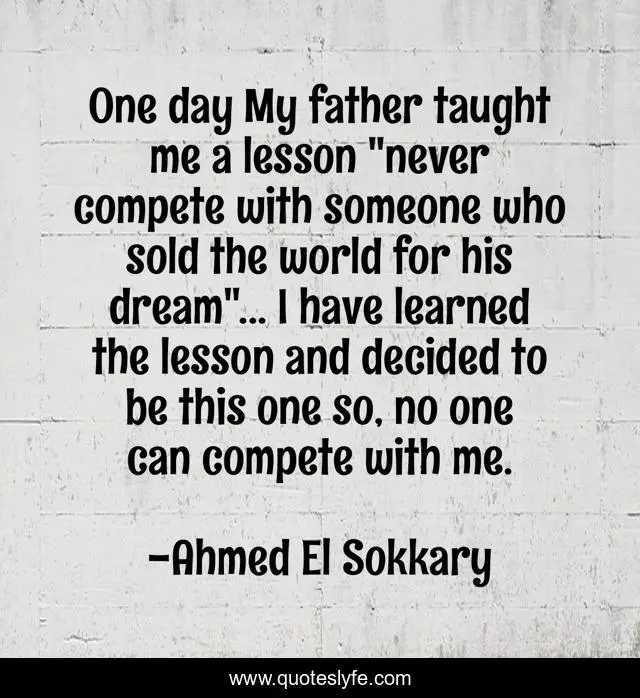 This page presents the quote "One day My father taught me a lesson "never compete with someone who sold the world for his dream"... I have learned the lesson and decided to be this one so, no one can compete with me.". Author of this quote is Ahmed El Sokkary. This quote is about confidence, life-lessons, power, positive, motivational, optimistic, inspirational, enthusiasm, dream,.