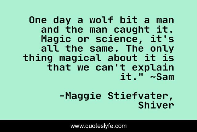 This page presents the quote "One day a wolf bit a man and the man caught it. Magic or science, it's all the same. The only thing magical about it is that we can't explain it." ~Sam". Author of this quote is Maggie Stiefvater, Shiver. This quote is about maggie-stiefvater, magic, sam, shiver, wolf, wolves, grace,.