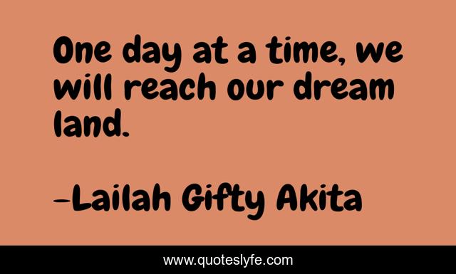 This page presents the quote "One day at a time, we will reach our dream land.". Author of this quote is Lailah Gifty Akita. This quote is about determination, wise-words, dream, never-give-up,.