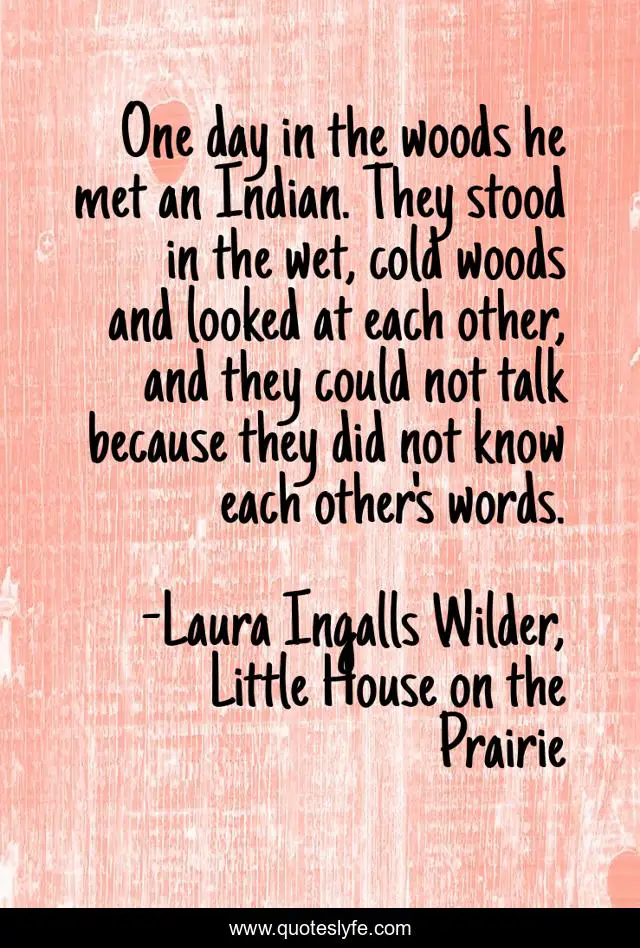 This page presents the quote "One day in the woods he met an Indian. They stood in the wet, cold woods and looked at each other, and they could not talk because they did not know each other's words.". Author of this quote is Laura Ingalls Wilder, Little House on the Prairie. This quote is about little-house-on-the-prairie, memoir, history,.