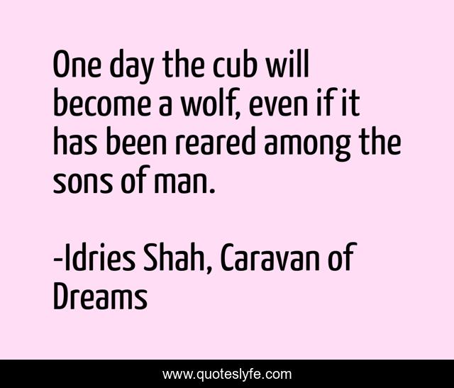 This page presents the quote "One day the cub will become a wolf, even if it has been reared among the sons of man.". Author of this quote is Idries Shah, Caravan of Dreams. This quote is about sufism, sufi-proverb, sufis, sufi-wisdom,.