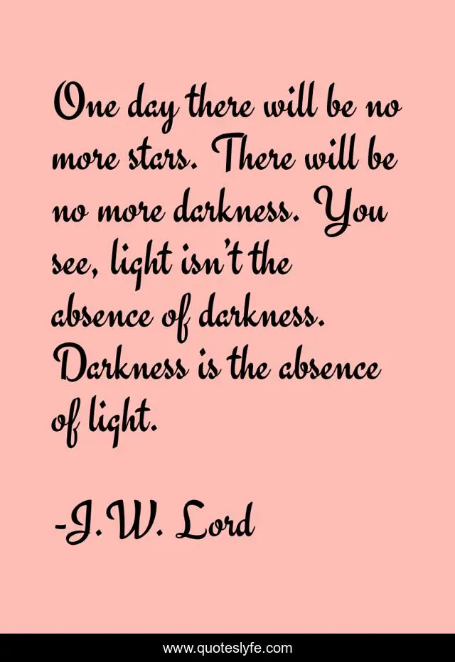 This page presents the quote "One day there will be no more stars. There will be no more darkness. You see, light isn’t the absence of darkness. Darkness is the absence of light.". Author of this quote is J.W. Lord. This quote is about light, darkness, stars,.