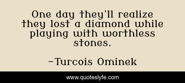 This page presents the quote "One day they'll realize they lost a diamond while playing with worthless stones.". Author of this quote is Turcois Ominek. This quote is about love, breaking-up, breakups, inspirational, love-hurts, enthusiasm, moving-on, affection,.