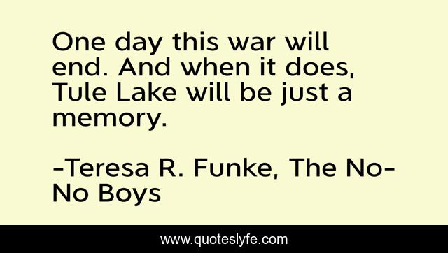This page presents the quote "One day this war will end. And when it does, Tule Lake will be just a memory.". Author of this quote is Teresa R. Funke, The No-No Boys. This quote is about remembering, japanese-internment, life, children-s, world-war-ii, war,.
