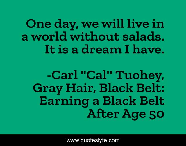 This page presents the quote "One day, we will live in a world without salads. It is a dream I have.". Author of this quote is Carl ''Cal'' Tuohey, Gray Hair, Black Belt: Earning a Black Belt After Age 50. This quote is about salads, humor, dream, world,.