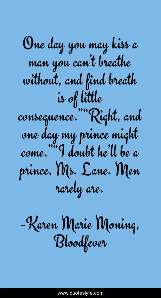 This page presents the quote "One day you may kiss a man you can’t breathe without, and find breath is of little consequence.”“Right, and one day my prince might come.”“I doubt he’ll be a prince, Ms. Lane. Men rarely are.". Author of this quote is Karen Marie Moning, Bloodfever. .