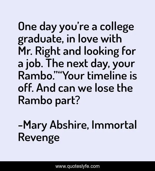 This page presents the quote "One day you’re a college graduate, in love with Mr. Right and looking for a job. The next day, your Rambo.”“Your timeline is off. And can we lose the Rambo part?". Author of this quote is Mary Abshire, Immortal Revenge. This quote is about urban-fantasy, vampire, vampires,.