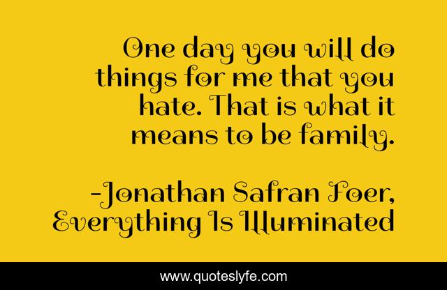 This page presents the quote "One day you will do things for me that you hate. That is what it means to be family.". Author of this quote is Jonathan Safran Foer, Everything Is Illuminated. .