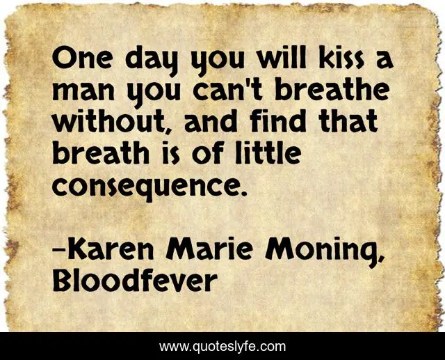 This page presents the quote "One day you will kiss a man you can't breathe without, and find that breath is of little consequence.". Author of this quote is Karen Marie Moning, Bloodfever. This quote is about love, kiss, affection,.