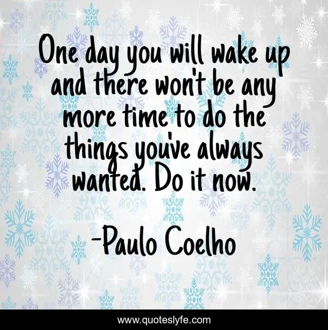 This page presents the quote "One day you will wake up and there won't be any more time to do the things you've always wanted. Do it now.". Author of this quote is Paulo Coelho. This quote is about life, desition, inspirational, time, enthusiasm, present,.
