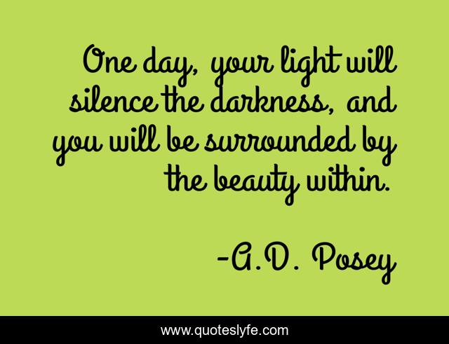 This page presents the quote "One day, your light will silence the darkness, and you will be surrounded by the beauty within.". Author of this quote is A.D. Posey. This quote is about women-wisdom, love, inspirational, energy, within, writers, quotes, ad-posey, happiness,.