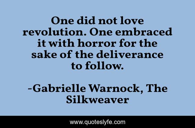 This page presents the quote "One did not love revolution. One embraced it with horror for the sake of the deliverance to follow.". Author of this quote is Gabrielle Warnock, The Silkweaver. .