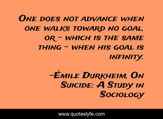 This page presents the quote "One does not advance when one walks toward no goal, or - which is the same thing - when his goal is infinity.". Author of this quote is Émile Durkheim, On Suicide: A Study in Sociology. This quote is about goals, goals-in-life,.