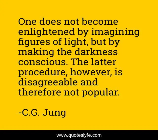 This page presents the quote "One does not become enlightened by imagining figures of light, but by making the darkness conscious. The latter procedure, however, is disagreeable and therefore not popular.". Author of this quote is C.G. Jung. This quote is about darkness, consciousness, mindfulness, light, integration, imagination, growth, shadow, enlightenment,.