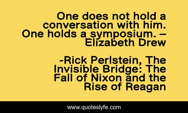 This page presents the quote "One does not hold a conversation with him. One holds a symposium. – Elizabeth Drew". Author of this quote is Rick Perlstein, The Invisible Bridge: The Fall of Nixon and the Rise of Reagan. This quote is about approachability, charisma, arrogance, listening, word-choice,.