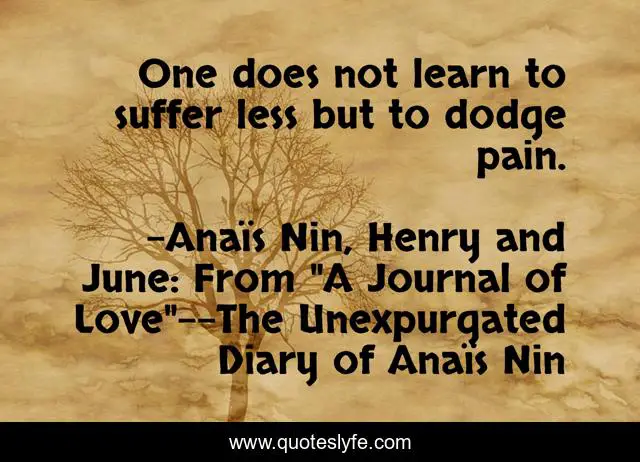 This page presents the quote "One does not learn to suffer less but to dodge pain.". Author of this quote is Anaïs Nin, Henry and June: From "A Journal of Love"--The Unexpurgated Diary of Anaïs Nin. This quote is about suffering, pain,.