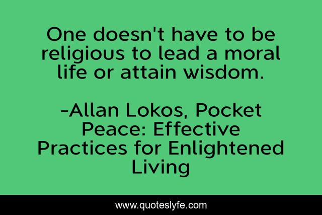 This page presents the quote "One doesn't have to be religious to lead a moral life or attain wisdom.". Author of this quote is Allan Lokos, Pocket Peace: Effective Practices for Enlightened Living. This quote is about buddhism, inspiration, health, mindfulness,.