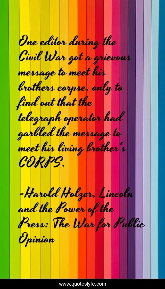This page presents the quote "One editor during the Civil War got a grievous message to meet his brothers corpse, only to find out that the telegraph operator had garbled the message to meet his living brother's CORPS.". Author of this quote is Harold Holzer, Lincoln and the Power of the Press: The War for Public Opinion. This quote is about faith, perspectives, despondency, bias, assumptions, panic, depression,.