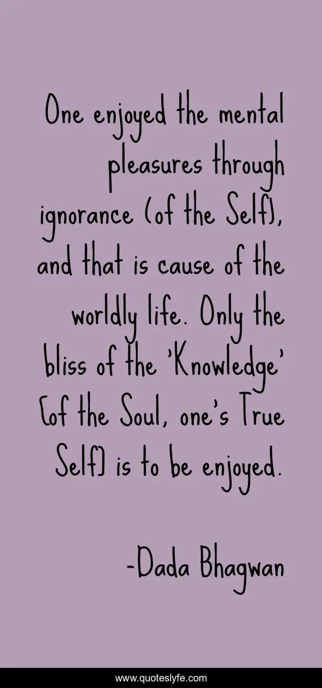 This page presents the quote "One enjoyed the mental pleasures through ignorance (of the Self), and that is cause of the worldly life. Only the bliss of the ‘Knowledge’ [of the Soul, one’s True Self] is to be enjoyed.". Author of this quote is Dada Bhagwan. This quote is about spiritual, self, soul, knowledge-of-the-self, knowledge-of-self, true-self, bliss, the-soul, the-self,.