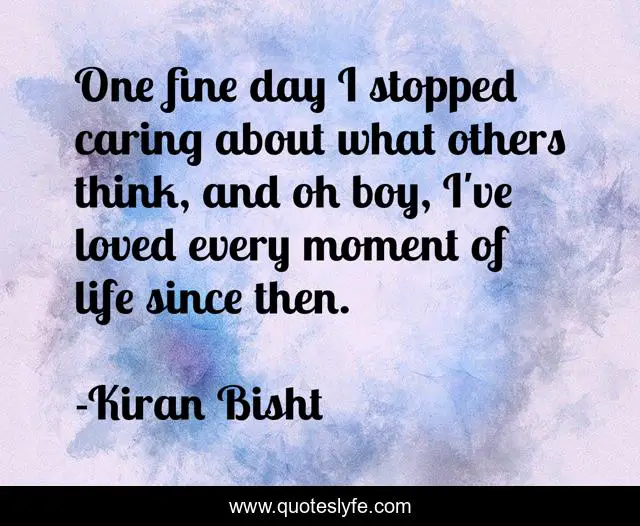 This page presents the quote "One fine day I stopped caring about what others think, and oh boy, I've loved every moment of life since then.". Author of this quote is Kiran Bisht. This quote is about be-careless, happiness, simple-life,.