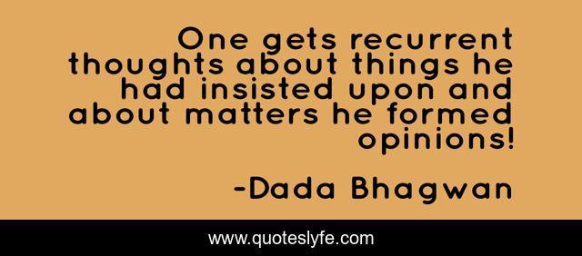 This page presents the quote "One gets recurrent thoughts about things he had insisted upon and about matters he formed opinions!". Author of this quote is Dada Bhagwan. This quote is about form-an-opinion, opinions, spiritual, thougths, to-form-an-opinion, insist, recurrent-thoughts, ego, insistence,.