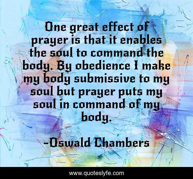 This page presents the quote "One great effect of prayer is that it enables the soul to command the body. By obedience I make my body submissive to my soul but prayer puts my soul in command of my body.". Author of this quote is Oswald Chambers. .