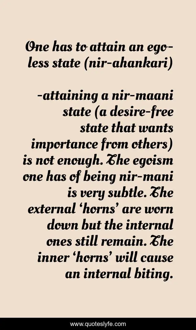 "attaining a nir-maani state (a desire-free state that wants importance from others) is not enough. The egoism one has of being nir-mani is very subtle. The external ‘horns’ are worn down but the internal ones still remain. The inner ‘horns’ will cause an internal biting. Quotes." Quoteslyfe.com, 2025. Fri. 05 Dec. 2025. <https://www.quoteslyfe.com/quote/One-has-to-attain-an-ego-less-67839>.