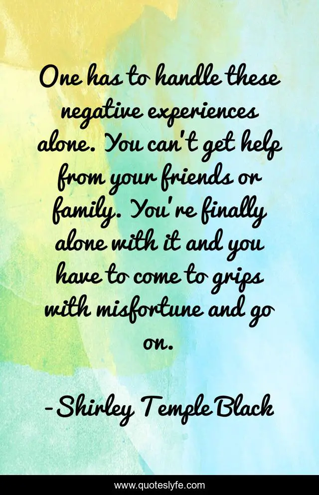 This page presents the quote "One has to handle these negative experiences alone. You can't get help from your friends or family. You're finally alone with it and you have to come to grips with misfortune and go on.". Author of this quote is Shirley Temple Black. This quote is about self, reliance,.