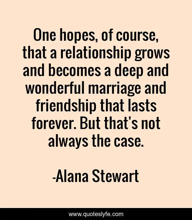 This page presents the quote "One hopes, of course, that a relationship grows and becomes a deep and wonderful marriage and friendship that lasts forever. But that's not always the case.". Author of this quote is Alana Stewart. This quote is about friendship, relationship,.