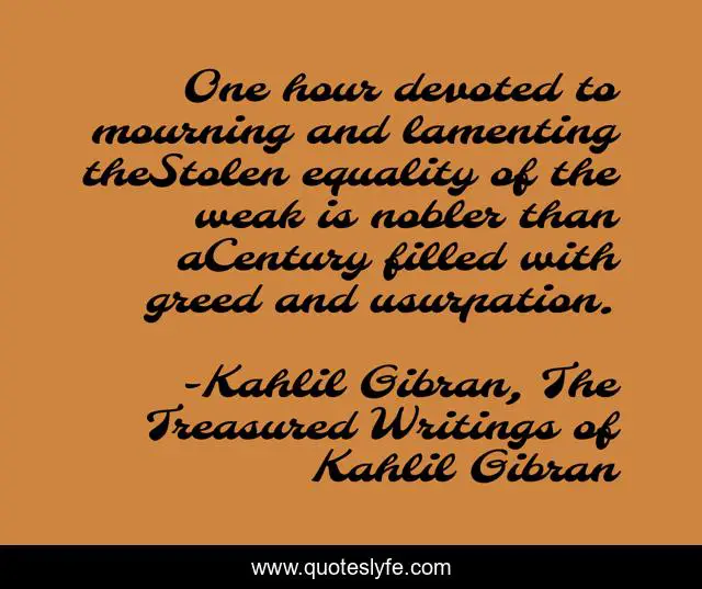 This page presents the quote "One hour devoted to mourning and lamenting theStolen equality of the weak is nobler than aCentury filled with greed and usurpation.". Author of this quote is Kahlil Gibran, The Treasured Writings of Kahlil Gibran. This quote is about justice, oppression, inequality,.