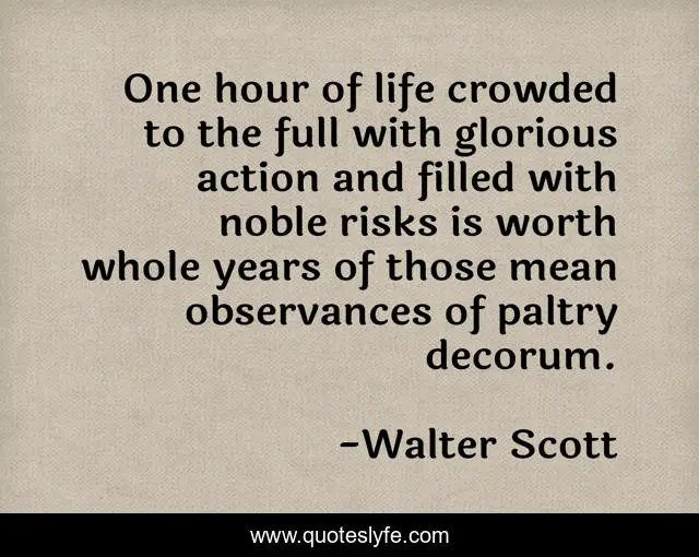 This page presents the quote "One hour of life crowded to the full with glorious action and filled with noble risks is worth whole years of those mean observances of paltry decorum.". Author of this quote is Walter Scott. .