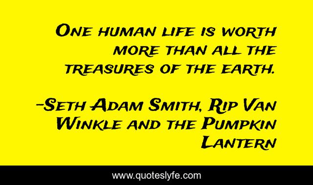 This page presents the quote "One human life is worth more than all the treasures of the earth.". Author of this quote is Seth Adam Smith, Rip Van Winkle and the Pumpkin Lantern. This quote is about sanctity-of-life, life, worth-of-a-soul, human-life, money, treasure, true-wealth, true-treasure, individual-worth,.