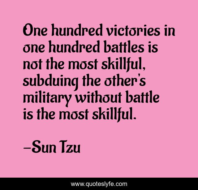 This page presents the quote "One hundred victories in one hundred battles is not the most skillful, subduing the other's military without battle is the most skillful.". Author of this quote is Sun Tzu. This quote is about battle, war, wisdom,.