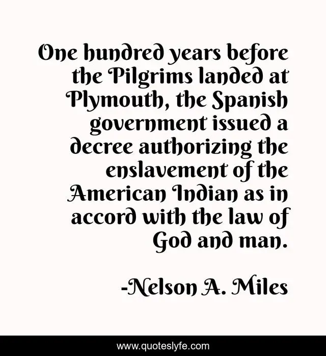 This page presents the quote "One hundred years before the Pilgrims landed at Plymouth, the Spanish government issued a decree authorizing the enslavement of the American Indian as in accord with the law of God and man.". Author of this quote is Nelson A. Miles. This quote is about god, law, man,.