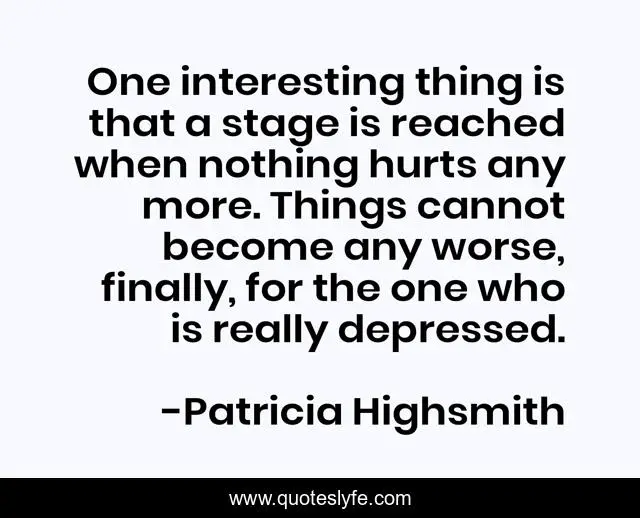 This page presents the quote "One interesting thing is that a stage is reached when nothing hurts any more. Things cannot become any worse, finally, for the one who is really depressed.". Author of this quote is Patricia Highsmith. This quote is about worse, depressed, hurt, hurts, depression, stage,.