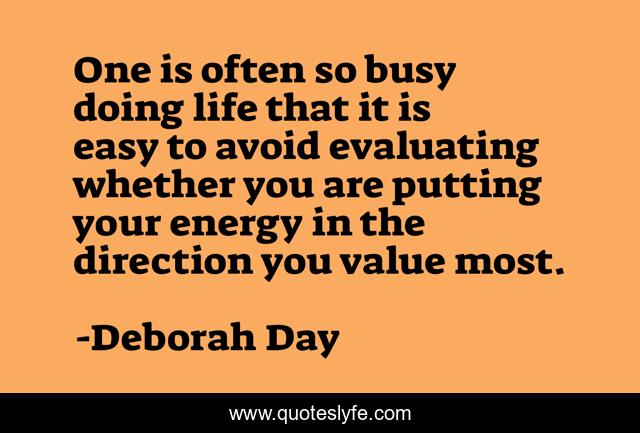 This page presents the quote "One is often so busy doing life that it is easy to avoid evaluating whether you are putting your energy in the direction you value most.". Author of this quote is Deborah Day. This quote is about values-in-life, values, purpose, wisdom,.