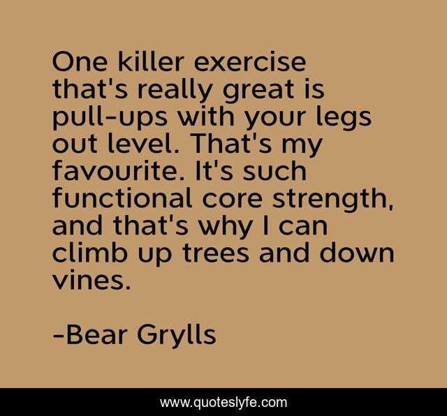 This page presents the quote "One killer exercise that's really great is pull-ups with your legs out level. That's my favourite. It's such functional core strength, and that's why I can climb up trees and down vines.". Author of this quote is Bear Grylls. This quote is about great, trees, exercise,.